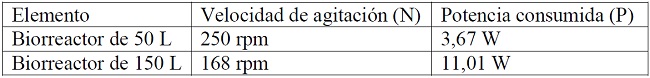 El número de potencia de trabajo del biorreactor prototipo fue de 1,53. En la tabla 3 se muestra los valores de Velocidad de agitación y potencia consumido entre el modelo y el prototipo.