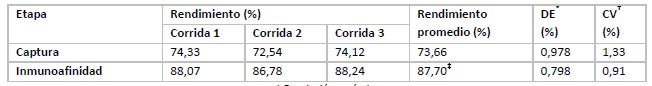 En la tabla 1 se resumen los valores de los rendimientos promedios de las etapas del proceso de aislamiento y purificación de la hCG. El rendimiento promedio durante la etapa de inmunoafinidad fue de 87,7 %, y los coeficientes de variación fueron inferiores al 5 %.