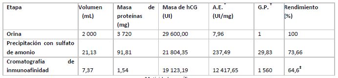 Con los valores promedios de las tres corridas se construyó la tabla 2, que refleja los resultados globales del proceso de obtención de hCG.La actividad específica de la hCG obtenida por el método propuesto fue de 12 417,65 UI/mg.