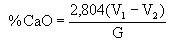 Procedimento - a) Transferir uma alíquota de 5 ml do extrato para erlenmeyer de 250 ml; (b) Adicionar 100 ml de água destilada, 5 ml da solução de KOH-KCN e 6 gotas do indicador calcon, agitando após a adição de cada reagente; (c) Titular o cálcio com a solução padrão de EDTA 0,010 M até a viragem do indicador da cor vinho para azul puro estável. Anotar o volume (V1) gasto; (d) Desenvolver uma prova em branco e anotar o volume (V2) gasto; (e) Calcular a porcentagem de CaO no material pela expressão: