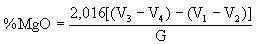 Procedimento - (a) Transferir uma alíquota de 5 ml do extrato para erlenmeyer de 250 ml; (b) Adicionar 100 ml de água destilada, 5 ml da solução tampão pH = 10 e 10 gotas da solução de eriocromo negro T, agitando após a adição de cada reagente; (c) Titular o cálcio mais o magnésio com a solução padrão de EDTA 0,010 M até a viragem do indicador da cor vinho para azul puro estável. Anotar o volume (V3) gasto; (d) Desenvolver uma prova em branco e anotar o volume (V4) gasto; e (e) Calcular a porcentagem de MgO no material pela expressão: