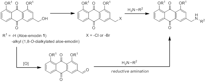 Starting from aloe-emodin, two transformations must be conducted before the reductive amination. The first one is the protection of the phenolic hydroxy groups to avoid any influence of the acidity of these groups in the reaction or in the workup after the completion of the reaction. Methyl groups were used as protective group in this case.