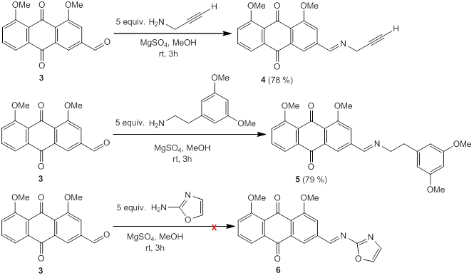 4,5-dimethoxy-9,10-dioxo-9,10-dihydroanthracene-2-carbaldehyde 3 (1.0 equiv) and a primary amine (5.0equiv) were dissolved in methanol. Anhydrous magnesium sulphate (5.0 equiv) was added. The resulting reaction mixture was stirred at room temperature in a flask equipped with a calcium chloride trap, and the reaction progress was monitored by TLC. On the completion of the reaction, the solvent was evaporated in vacuo, the solid was extracted with dichloromethane and filtered. After filtration, the solvent was evaporated to afford the product. No further purification was needed.