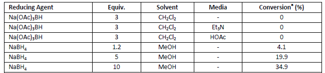 Reductive amination is a well-known procedure. Several conditions and reducing agents have been reported for this type of reaction. Hydride reducing agents such as sodium triacetoxyborohydride, sodium cyanoborohydride and sodium borohydride have been thoroughly used as reducing agents for their selectivity.21,22 Other reagents have been reported for reductive amination, whichincludeborane-pyridine 22, Ti(OiPr)4/NaBH3CN 23, borohydrideexchange resin 24 and NaBH4/Mg(ClO4)2.25