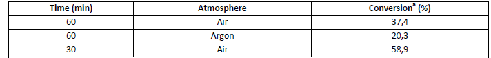 Considering the previous results, the reaction was then conducted in the same conditions, but the reaction time was set at 30 minutes. An increased in the conversion up to 58.9 % was observed. This result suggests the idea that the imine is a thermodynamically more stable product, probably due to resonance stabilization, and it is formed by oxidation of the desired product at longer reaction times.
