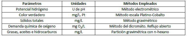 El agua residual afluente al sistema de tratamiento estuvo compuesta por el agua oleosa drenada del tanque de lodo de la Central Eléctrica fuel oil Santa Clara Industrial “Los Alevines”. A dicha agua residual afluente y efluente del humedal se le determinaron los parámetros: pH, color verdadero (CV), grasa, aceites (G,A) e hidrocarburo (HC), demanda química de oxígeno (DQO) y sólidos totales (ST). Estos parámetros se determinaron de acuerdo al Standard Methods 12 (tabla 1). El muestreo se realizó sobre la base del criterio de toma de muestras puntuales, según Instituto Nacional de Recursos Hidráulicos.13