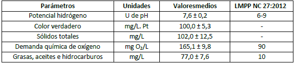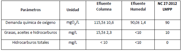 Los valores de los parámetros determinados al agua residual oleosa afluente se observan en la tabla 2, tanto la Demanda Química de Oxígeno, como las grasas, aceites e hidrocarburos se encuentran por encima del Límite Máximo Permisible Promedio para el cuerpo receptor B (Ríos y embalses) según (NC 27: 2012).11