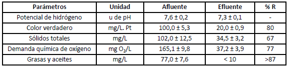 Los valores de los parámetros determinados del efluente del humedal subsuperficial horizontal a las 4 semanas de funcionamiento y los porcetajes de remoción obtenidos se observan en la tabla 3. Estos resultados son similares a los obtenidos por González y colaboradores; Martínez y colaboradores 5,6 evidenciando la eficiencia en la remoción de los contaminantes en el sistema de tratamiento evaluado.