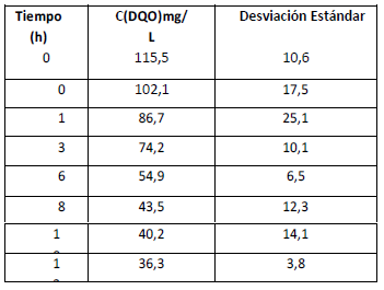 Los valores medios y la desviación estándar de los datos experimentales obtenidos para el estudio cinético de la remoción de materia orgánica en el humedal se muestran en la tabla 5. Se observa una disminución de la concentración de DQO con el incremento del tiempo de retención del agua residual en el humedal. El análisis realizado al agua residual efluente instantáneamente (tiempo 0,1) mostró la importancia del tiempo de retención de la misma en el lecho del humedal para lograr la remoción de los contaminantes, ya que la disminución de la DQO obtenida en el agua residual efluente con un tiempo de retención de 0,1 h no es significativa comparada con la obtenida a partir de las 6 h de tiempo de retención.