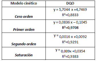 La ecuación de la recta y el coeficiente de correlación para los modelos cinéticos evaluados se muestran en la tabla 6, observándose un mejor ajuste para el modelo de primer orden.