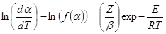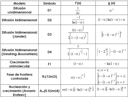 [2]Al graficar el miembro izquierdo vs. 1000/T para cada función f (α), el modelo cinético que mejor describe la reacción es seleccionado a partir de los valores del coeficiente de regresión (r). Entonces, el valor de la pendiente estará relacionado con el término E/R y el intercepto permite calcular Z.22-24