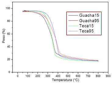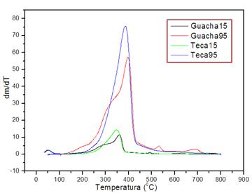 En la figura 1 se muestra la influencia de la velocidad de calentamiento, en el perfil pirolítico de las maderas ecuatorianas. Un incremento de éstade 15 a 95(C, para cada madera, tiende a desplazar la temperatura máxima (es la temperatura a la cual la velocidad de pérdida de masa es máxima), durante el proceso de degradación de ambas maderas, como se observa en la figura. Varios autores han indicado que las reacciones de conversión de biomasa, son cinéticamente más lentas a mayor tasa de calentamiento.16-17) Además, se incrementa la velocidad de degradación térmica, lo que resulta lógico porque se le suministra más calor a la muestra en menor tiempo y porque aumenta la producción de la materia volátil. Relacionado con esto último, Damartzis y colaboradores explican que cuando la velocidad de calentamiento es alta, se alcanza un flujo calórico alto que reduce la viscosidad de la materia sólida fundida, lo que intensifica la reacción de formación de volátiles.24 Para ambas velocidades de calentamiento se observa que Teca tiene mayor velocidad de degradación, lo que coincide con la mayor materia volátil identificada por análisis inmediato en ella.