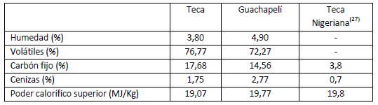 El análisis inmediato de las maderas estudiadas es presentado en la tabla 2. Los contenidos de humedad menor al 10 % para ambas maderas, las convierten en atractivas para su termoconversión a través de pirólisis.