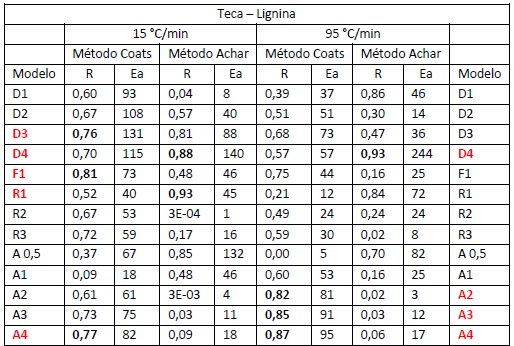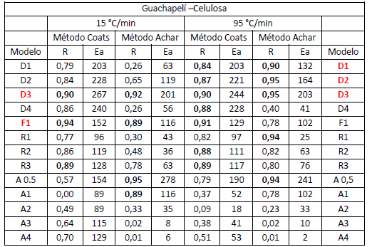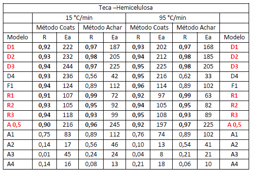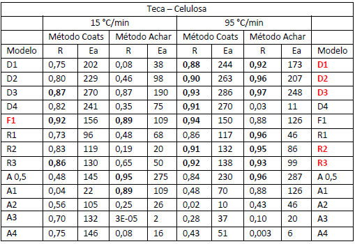 La tabla 4 muestran los resultados cinéticos a 15 y 95°C/min respectivamente, de la devolatilización de la celulosa contenida en Teca. A partir de los criterios explicados para la selección, en el caso de la primera (, F1 es el único modelo elegido, a diferencia de la segunda velocidad de calentamiento estudiada que son D1, D2, D3 y R2, R3. Quesada y colaboradores encontraron para Fernán Sánchez en esta etapa, los modelos F1, A0.5 y A3.23) Se demuestra que no hay coincidencia entre los modelos cinéticos seleccionados para ambas β, en esta investigación.
