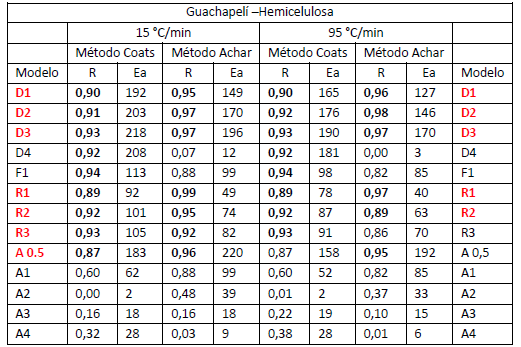 En el caso de la etapa de devolatilización de la hemicelulosa (tabla 6), se identifican a 15 C(/min los modelos cinéticos D1,D2,D3,R1,R2,R3 y A0,5 y para 95 C(/min los modelos D1,D2,D3,R1 y R2. Vuelven a precisarse los modelos difusivos y los de avance de la interfase, como los que más prevalecen fundamentalmente en esta etapa. Estos resultados también evidencian la complejidad de los procesos de pirólisis de biomasa, objeto de estudio. Fueron calculados los valores de Ea entre 74,1-220,3 kJ/mol a 15°C/min y 40-190,3 kJ/mol a 95 °C/min. A diferencia de la madera Teca, en Guachapelí se obtienen diferentes modelos cinéticos y valores de Ea para esta etapa, a ambas (.