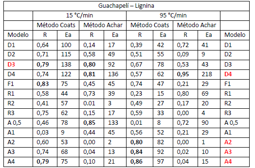 Para la última etapa de descomposición de la biomasa (tabla 8) bajo atmósfera inertea 15 C(/minel modelo D3y 95 C(/min los D4, A2, A3 y A4 son los de mayor coeficiente de correlación.Los valores de energía de activación se encuentran en los intervalos de 92-137 kJ/mol y 82-218 kJ/mol respectivamente. Para la madera Fernán Sánchez los modelos que prevalecen son D2, D3 y la Ea fue entre 83-153 kJ/mol y para Teca fueron D3,D4,F1,R1,A4 y D4,A2,A3,A4 para 15 y 95C(/min respectivamente.23-24) Llama la atención que solo en esta etapa de la lignina, para ambas biomasas, en algunas (, no hay coincidencia entre los modelos cinéticos identificados por Coats y Achar. Las pocas veces que esto ha ocurrido se escogen todos los modelos como posibles y demuestra la validez de la metodología de cálculo aplicada. Recuerde que la mayor parte de los autores realizan el estudio cinético utilizando una única expresión matemática y condiciones experimentales.
