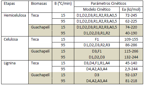 El estudio cinético realizado identificó los modelos cinéticos y los valores de energía de activación para la devolatilización de hemicelulosa, celulosa y lignina para Teca y Guachapelí, demostrándose que no se debe escoger a priori el modelo F1 como el determinante.Se demuestra la influencia de la velocidad de calentamiento y del tipo de biomasa en los resultados cinéticos obtenidos, por lo tanto, no deben extrapolarse resultados de bajas a altas velocidades de calentamiento