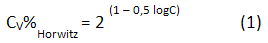 Para el segundo se midieron los mismos parámetros estadísticos a seis mediciones realizadas bajo las mismas condiciones medidos en 3 días consecutivos. Con los resultados se determinó la desviación estándar (S) 16 y el coeficiente de variación entre los días (CV%). El análisis de varianza de un solo factor también se realiza para determinar el valor de Fcalculado con el objetivo de conocer si existen o no diferencias significativas entre los resultados de los diferentes días. Otro parámetro estadístico que dio criterio sobre la reproducibilidad intermedia fue el coeficiente de variación teórico según Horwitz (CV% Horwitz), el cual se calculó según ecuación 1.