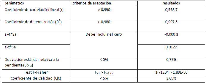 Se prepararon tres curvas de calibración para verificar su linealidad en el intervalo de concentraciones del analito estudiado. A cada punto de la curva se le realizaron tres réplicas. Con los valores experimentales, empleando la herramienta de cálculo Microsoft Excel 2016, se calculó el coeficiente de correlación lineal (R) y la desviación estándar de la pendiente (Sb). Se realizaron también las pruebas de linealidad y de proporcionalidad mediante la evaluación estadística de la prueba t- Student, la prueba F-Fisher y se calculó el coeficiente de calidad (QC), como un mejor indicador del modelo lineal.