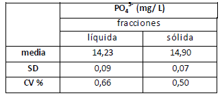 En la tabla 2 se muestran los resultados de la concentración de ortofosfatos obtenidos para el estudio de repetibilidad en seis réplicas de las muestras de digestatos, realizadas por el mismo analista, en un mismo día, con el mismo espectrofotómetro y sin variaciones en reactivos. En estos resultados se aprecia una baja dispersión en cuanto a los valores de concentración, debido a que el CV % es inferior al 3%, lo que muestra que el método es preciso en términos de repetibilidad en el intervalo estudiado.