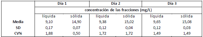 Por otro lado, según la prueba de Cochran, la variación del método se considera igual para los tres días de estudio, ya que el valor calculado es menor que el valor crítico; este criterio confirma la reproducibilidad del método entre días. Por lo anterior expuesto se puede afirmar que los resultados obtenidos en los diferentes días no difieren entre sí y que el método es preciso para las fracciones líquida y sólida del digestato analizado.