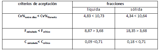 Como se muestra en la tabla 4, los cálculos realizados para el coeficiente de variación entre los días y de Horwitz, confirman que, para todos los casos el CV%(entre días) < CV% (Horwitz), por tanto, se considera que el factor día influye en la reproducibilidad. Al comparar los valores obtenidos en el análisis de varianza de un solo factor se muestra que el valor de Fcalculado > Fcrítico, para las fracciones del digestato analizado. Según lo reportado en la literatura 15,16, aunque el valor de Fcalculado es mayor Fcrítico, si el CV% Entre días < CV%/(Horwitz), el método es también considerado de precisión aceptable.