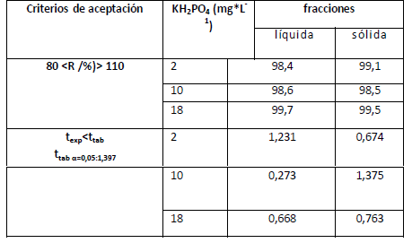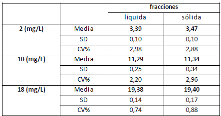 Se desarrolló un test de Student (t) para n-1 grados de libertad y α=0,05, con el objetivo de demostrar si los recobrados obtenidos son o no significativamente diferentes de 100, (tabla 6). En este análisis se obtuvo para todos los casos se cumple que la texp < ttab en las fracciones del digestato bajo estudio, por lo que se puede concluir que no existen diferencias significativas al 100% en el recobrado en todo el intervalo de concentraciones analizadas (2 a 18 mg/L). Con lo anterior se confirmó la veracidad, con un 95 % de confianza, de la técnica analítica empleada.