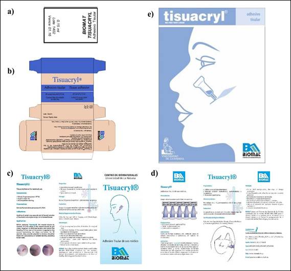 El Tisuacryl® se comercializa en ampolletas de polipropileno de alta densidad (envase primario), con un volumen de producto de 0,15 mL, que se presentan en estuches de cartón (envase secundario) con 5 ampolletas. Cada ampolleta porta una etiqueta con el nombre del producto, el fabricante, el número de lote y la fecha de vencimiento. En el interior de cada estuche se incorpora un material impreso que constituye la literatura con detalles técnicos para la utilización del producto. En las figuras 1a y 1b se muestra el diseño de la etiqueta del envase primario y el envase secundario del Tisuacryl®, respectivamente.