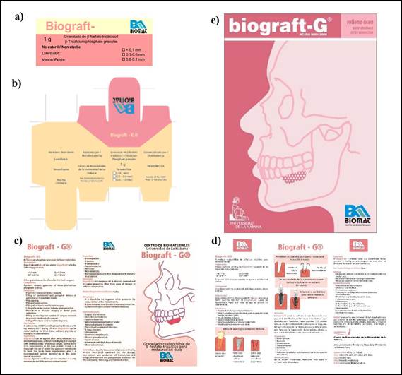 Para el Biograft-G® se diseñó la etiqueta (Figura 3a) que se adhiere al frasco de vidrio (envase primario) que contiene 1 g del producto. La etiqueta incluye entre sus datos el número de lote, la fecha de vencimiento y el diámetro de la granulometría correspondiente. El diseño del envase secundario (caja de cartón) de los frascos se muestra en la figura 3b. Se elaboró la literatura técnica acompañante del producto que se incluye como volante impreso en el interior de la caja.