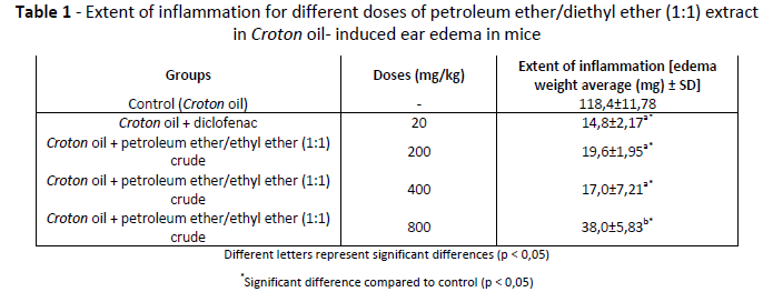 Table 1 reports the edema weight average and standard desviation for each experimental group. Inflammation seen in the negative control group was significantly higher than that seen for the different doses of crude (p< 0,05). The highest dose (800 mg/kg) showed higher inflammation values and had statistical difference with regard to doses of 200 and 400 mg/kg.