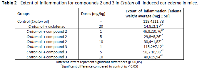 Table 2 shows that both compounds 2 and 3 significantly decrease inflammation. All doses of compound 2 showed anti-inflammatory activity compared to control group (Croton oil), whereas only the lowest dose of compound 3 (1 mg/kg) did not show a significant decrease in inflammation.