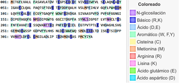 Mediante la búsqueda realizada en el NCBI se obtuvo la secuencia de aminoácidos en formato FASTA de la enzima tirosinasa hipotética, constituida por 337 residuos de aminoácidos. Por su parte, GPMAW Lite identificó cinco modificaciones postraduccionales, correspondientes a N glicosilaciones (figura 1).
