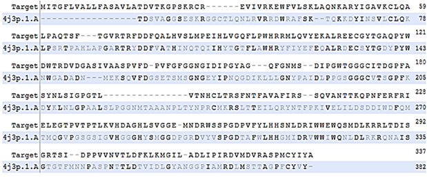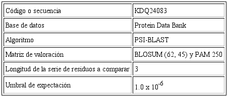 Para encontrar secuencias plantillas potencialmente similares a la de interés, se utilizó el algoritmo BLAST (Herramienta de Alineamiento Básico Local), a partir del servidor de la base de datos Protein Data Bank (PDB). Los parámetros de alineamiento se muestran en la Tabla 1. Además, para validar los resultados del BLAST, se utilizó el servidor del Swiss model en su opción "buscar plantillas" en la librería. La librería del Swiss model utiliza tanto BLAST como HHblits, como buscadores; para identificar las plantillas y obtener los alineamientos entre la proteína a modelar y su plantilla. El uso combinado de estos dos métodos garantiza el alineamiento correcto, incluso cuando no hay alta identidad de secuencia (homología) entre el modelo y su plantilla. A partir de 89 plantillas, se seleccionó la plantilla 4j3p A con 40.92% de identidad de secuencia.