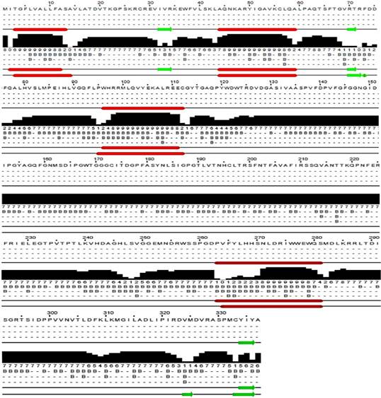 Los posibles plegamientos de la estructura secundaria indicaron la presencia, en mayor proporción, de estructuras en forma de siete lazos (78,91 %), cuatro hélices α (18,69 %) y cuatro de láminas β (2,4 %). Las hélices α mostraron porcentajes de confiabilidad mayores que siete (figura 3). Para el resto de la estructura secundaria, el “nivel de confiabilidad” se mantuvo preferentemente por encima de cinco. La estructura obtenida tiene un nivel intermedio de confiabilidad. El predominio de estructuras en forma de lazos, sugiere una estructura secundaria poco definida.22