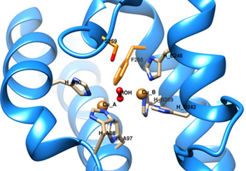 El sitio activo se encuentra protegido por dos residuos de aminoácidos, Fenilalanina F 265 y Serina S 259. El residuo voluminoso de Fenilalanina se ubica sobre el centro activo, específicamente sobre el CuA. Este residuo funciona como “puerta” al bloquear el acceso al sustrato (figura 5). El bloqueo del sitio A por la Fenilalanina, se relaciona con la pérdida de actividad monofenolasa de las catecol oxidasa. La función del residuo de S 259 aún no está clara, pero pudiera relacionarse con la activación del sustrato. Dicho residuo de F 265 pudiera ser una explicación a las diferencias entre catecol oxidasas y tirosinasas.6,23