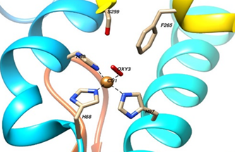 Para los tres servidores, los modelos de la tirosinasa hipotética de P. ostreatus PC15 son similares a sus proteínas homólogas en hongos (catecol oxidasas). Cada modelo es un homodímero, con dos sitios idénticos de unión a metales. Estos centros están compuestos por un átomo de Cu en su forma natural y con algunos residuos conservados en el sitio activo. Dicho sitio está formado por tres histidinas y una molécula de agua. Esta región se asemeja a una esfera hidrofóbica que protege al sitio activo y se pliega en un bulbo de cuatro α hélices, con los sitios de unión al cobre, excepto la histidina (H) H88 (figura 4). El ion CuA es coordinado por H 80, H 88, H 97; mientras el ion CuB por H 242, H 246 y H 269.