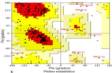 Se evaluó la calidad de los modelos por medio de Procheck. Se consideraron las restricciones de los ángulos diedros φ y ψ, proporcionadas por el diagrama de Ramachandran según la herramienta Procheck.16 Este diagrama proporciona la distribución de los ángulos de torsión de una estructura proteica y permite pronosticar las regiones favorecidas, permitidas y no permitidas para estos ángulos. Lo cual sirve como indicador de la calidad de los modelos de la estructura tridimensional de una proteína.17