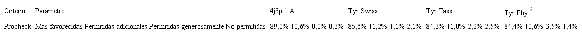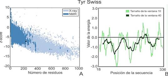 Los parámetros de calidad, estimados según la herramienta Procheck, indicaron que las estructuras 3D calculadas resultaron adecuadas. Dichos parámetros fueron similares a los de la estructura de partida 4j3p.1.A (tabla 3). Los valores fueron cercanos al 90 % de residuos de aminoácidos para las regiones más favorecidas en el diagrama de Ramachandran, lo cual valida los tres modelos propuestos. Los diagramas de Ramachandran señalan a Tyr Swiss como mejor modelo con 85,6% de residuos en regiones más favorecidas (figura 6A).25 En el resto de los modelos los porcentajes de residuos fueron menores, Tyr Tass (84,4%) y Tyr Phy2 (84,3%).