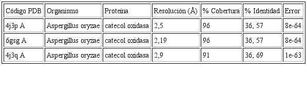 Los mayores porcentajes de identidad (36,57 %), cobertura (96 %) y el valor de error (E=8x10-64) más bajo pertenecen a las estructuras 4j3p y 6GSG de Aspergillus oryzae (tabla 2). El valor de E representa el número de alineamientos fortuitos que puede esperarse entre la secuencia en estudio y cualquier otra de las existentes en una base de datos. Por lo tanto, entre más cercano a 0 sea el valor de E, más significativo es el alineamiento entre la secuencia que se analiza y la relacionada.20