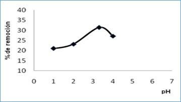 Este parámetro es esencial en procesos de este tipo debido a su influencia en la solubilidad de las especies químicas presentes o en la activación de los grupos funcionales de la biomasa, al favorecer la protonación o no de grupos aminos, amidas, hidroxilos y carboxilos.17 Esta última razón hace menos o más lábil la interacción de los centros metálicos, con los sitios de unión del sólido utilizado. Se ha demostrado que éste parámetro modifica la adsorción de los metales, según tipo de biomasa y adsorbato empleado.18-19