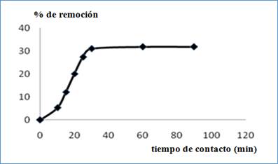 El tiempo de contacto es otro parámetro que influye en el proceso de adsorción de iones Cu2+ de una disolución, utilizando bagazo de caña. Los resultados de este estudio se presentan en la figura 2.