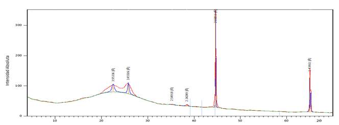 Para comprobar la carbonización parcial de la biomasa debido a la acción deshidratante del ácido fosfórico, se decide caracterizar por difracción de rayos X el bagazo de caña impregnado con ácido fosfórico (ver figura 4). Se identifican al menos dos fases: una fase con estructura predominantemente amorfa, característica de sólidos porosos, debido a la presencia de un pico ancho alrededor de los 24° en 2θ. Pinedo y colaboradores 22 encontraron un pico similar en carbones activados modificados y lo asigna al plano grafítico d002 y la otra fase más cristalina por la presencia de al menos 4 picos más estrechos, debe corresponder a la presencia de materia inorgánica, muy probablemente relacionada con las cenizas presentes en este residuo.