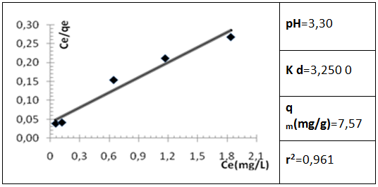 Como se observa, la capacidad máxima de adsorción (qm) alcanza el valor de 7,57 mg/g a un pH de 3,30 unidades. El valor obtenido para el coeficiente de correlación indica el grado de ajuste de los datos experimentales al modelo matemático utilizado, lo cual permite inferir que el modelo de Langmuir explica satisfactoriamente el proceso de adsorción estudiado.