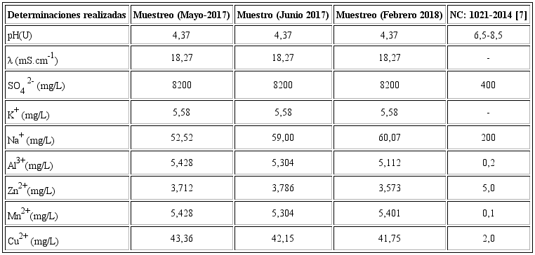 En este sentido, la “Laguna azul” de “El Cobre” situada en Santiago de Cuba, es un recurso hídrico que se ha formado, debido a las excavaciones mineras procedentes de la explotación a cielo abierto de las minas de cobre en esta ciudad. En la misma se han detectado elevadas concentraciones de iones sulfato (tabla 1), que puede ser justificada por la presencia de algunos minerales constituidos por este anión, así como la realización de un proceso de extracción que incluye la lixiviación con ácido sulfúrico. Esto puede influir también en la acidez identificada en estas aguas y que se verifica a través de su pH. Por último se identifica presencia de varios iones, sus concentraciones totales se presentan en la tabla 1, algunas de las cuales (Al3+ y Mn2+) son superiores a los valores normados para este tipo de agua, de ahí lo imprescindible de realizar trabajos para la remediación de las mismas.6