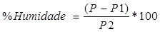 Onde: P - Peso do recipiente com a amostra húmida em gramas; P1 - Peso do recipiente com a amostra seca; P2 - Peso da amostra em gramas.