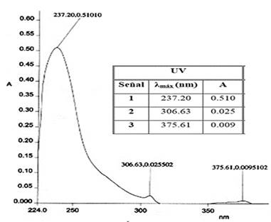 En la figura 1, se muestra el perfil de intensidad (absorbancia, A) / posición (longitud de onda, λmáx, en nm) del espectro de UV-Vis del AE, caracterizado por una banda de máxima absorción e intensidad media a 237,2 nm que puede ser asociada a las transiciones electrónicas solapadas de varios componentes con anillos aromáticos y con enlaces dobles carbono-carbono, como monoterpenos y sesquiterpenos en los que se producen transiciones de tipo π → π*, esta banda por su intensidad puede ser usada para realizar determinaciones semicuantitativas y ofrecer para el análisis químico valores proporcionales a su concentración; así como podría ser útil para estudios de estabilidad.