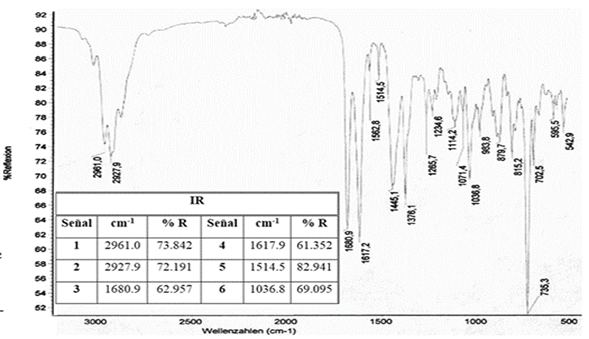 Por otro lado, el perfil del espectro infrarrojo del AE (Figura 2) muestra las frecuencias (en cm-1) de las señales más significativas, que corresponden a las vibraciones de enlaces dobles carbono-carbono conjugados y de núcleos aromáticos en 1 617,2 y 1 514,5 cm-1 y las vibraciones de 1 680,9 cm-1 característico de grupos carbonilos conjugados a insaturaciones que pudiesen corresponder a sesquiterpenos cetónicos. Además, con intensidad media las señales por debajo de 3000 cm-1 típicas de corrimiento hipsocrómico de grupos hidroxilos y del estiramiento típico de los enlaces de átomos de carbono-oxígeno (C-O) en alcoholes alifáticos y asociado también a fenilheptanos hidroxilados.