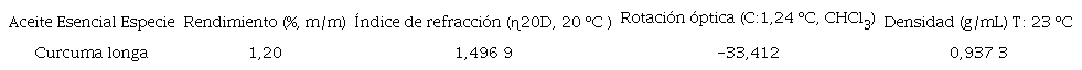 El AE de C. longa es levógiro como muestra el valor de la rotación óptica en la tabla 1. Es ligeramente menos denso que el agua y demostró buena solubilidad en disolventes orgánicos; en disolventes poco polares como éter de petróleo y diclorometano, medios como el acetato de etilo y polares como la acetona, el etanol y mezclas acuoetanólicas. Este patrón de solubilidad es típico de los aceites de alto contenido de constituyentes oxigenados en su composición, como pueden ser los sesquiterpenos oxigenados.9,10