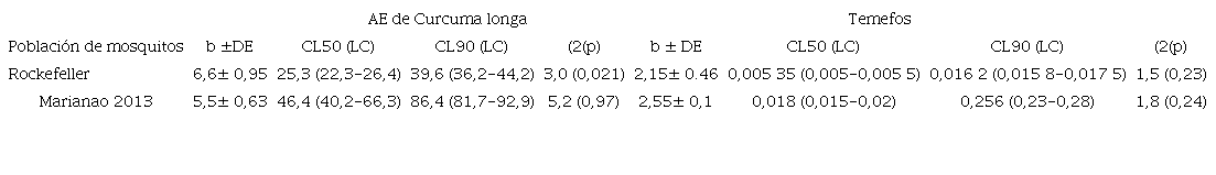 Ali et al. en 2015 23, informaron para A. aegypti una CL50 para el aceite esencial del rizoma de C. longa igual a 12,7 mg/L (10,7-14,9 mg/L), sin embargo, Kalaivani et al., en 2012 24 obtuvieron una CL50 muy superior (115,6 mg/L) al evaluar C. longa en larvas de A. aegypti. Todas las concentraciones mencionadas se encuentran en un intervalo similar a los obtenidos en el presente estudio.
