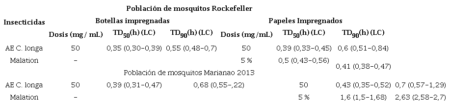 Como se observa en la tabla 3, mediante la metodología de papeles impregnados en la evaluación de la actividad adulticida Curcuma longa mostró similares resultados frente a las dos poblaciones en cuanto al tiempo en que se logró el 50 % de derribo de los mosquitos, existió mayor diferencia en cuanto al tiempo en que se logró la caída del 90 % de los mosquitos para la población Marianao 2013.